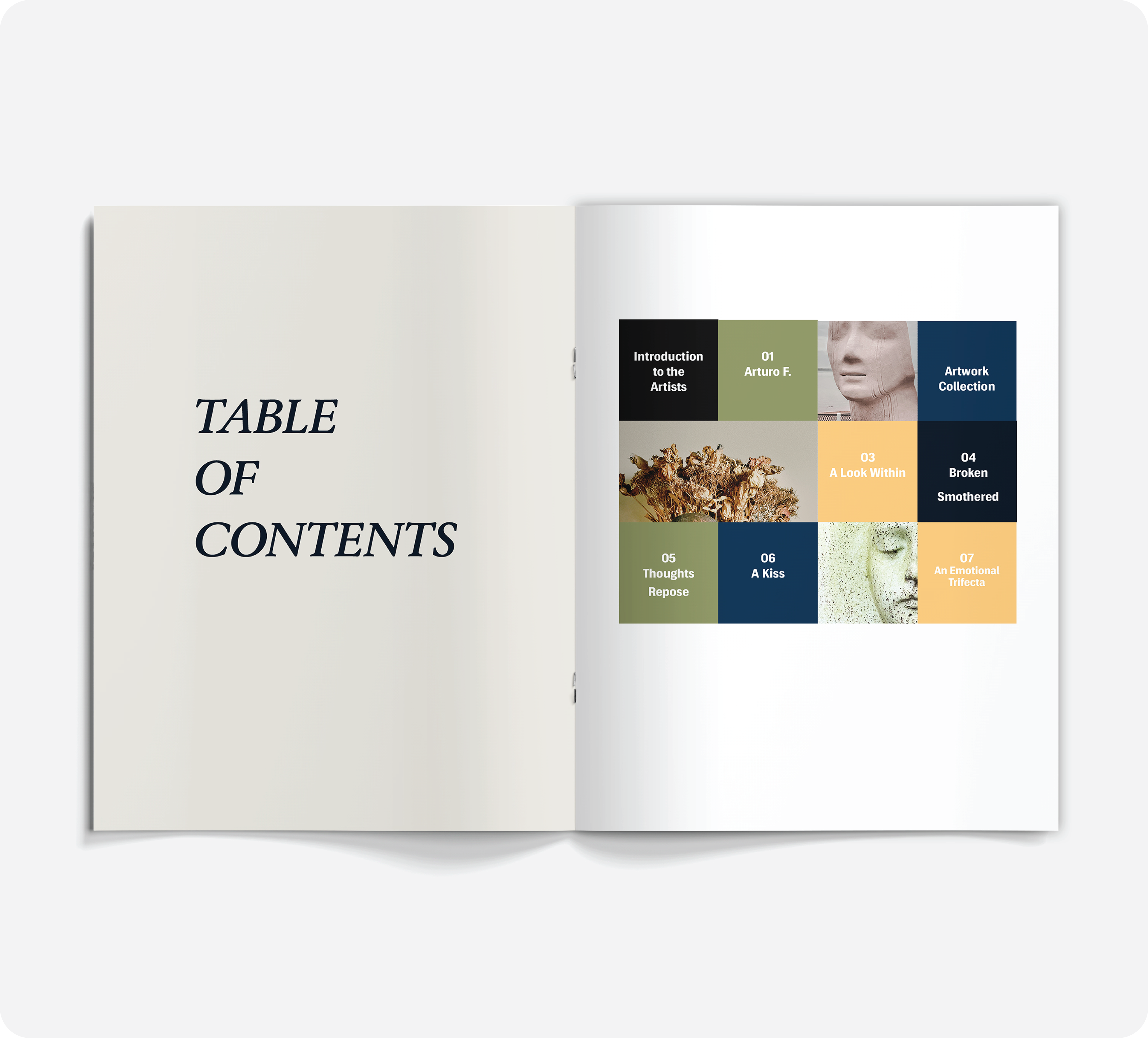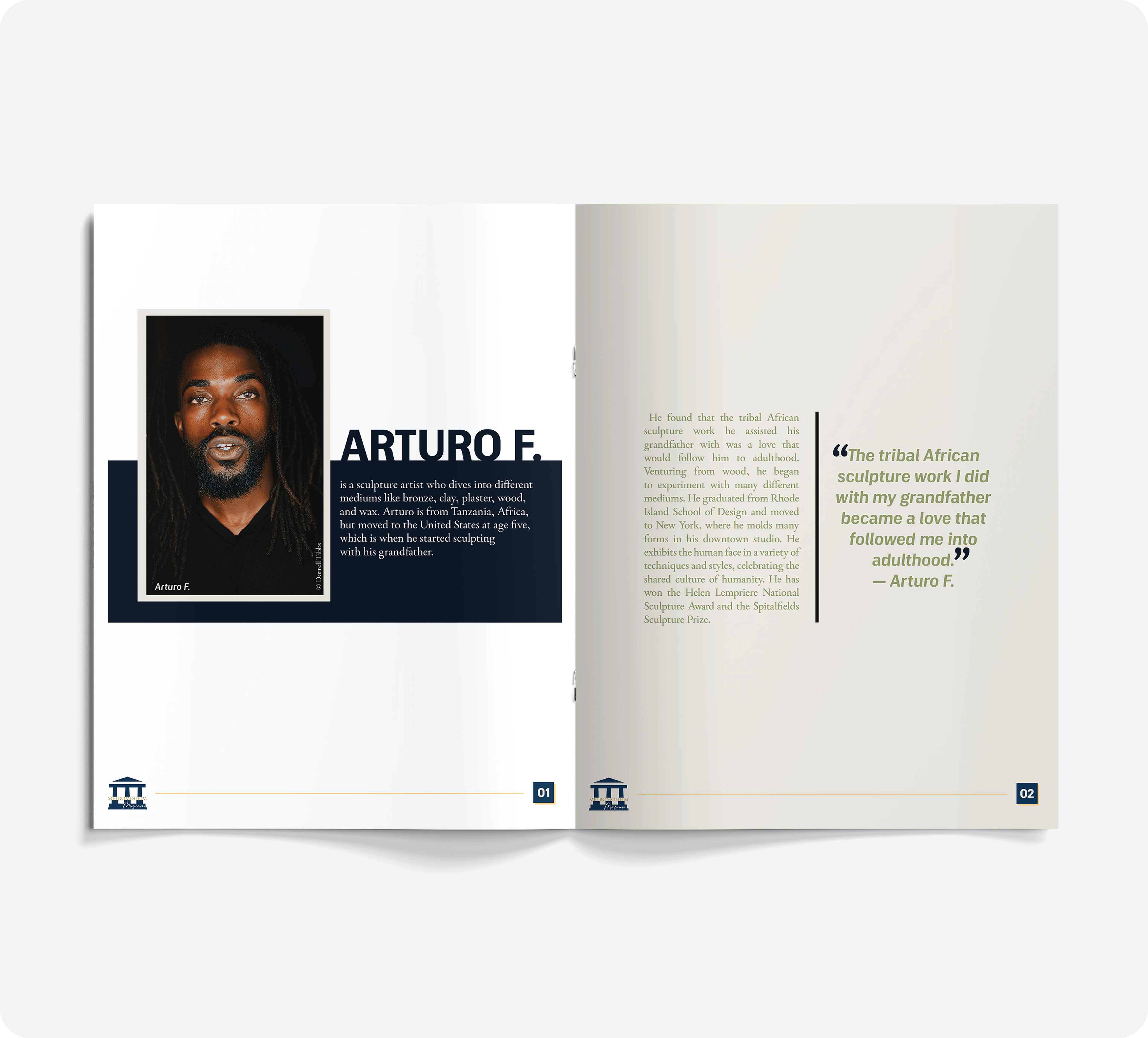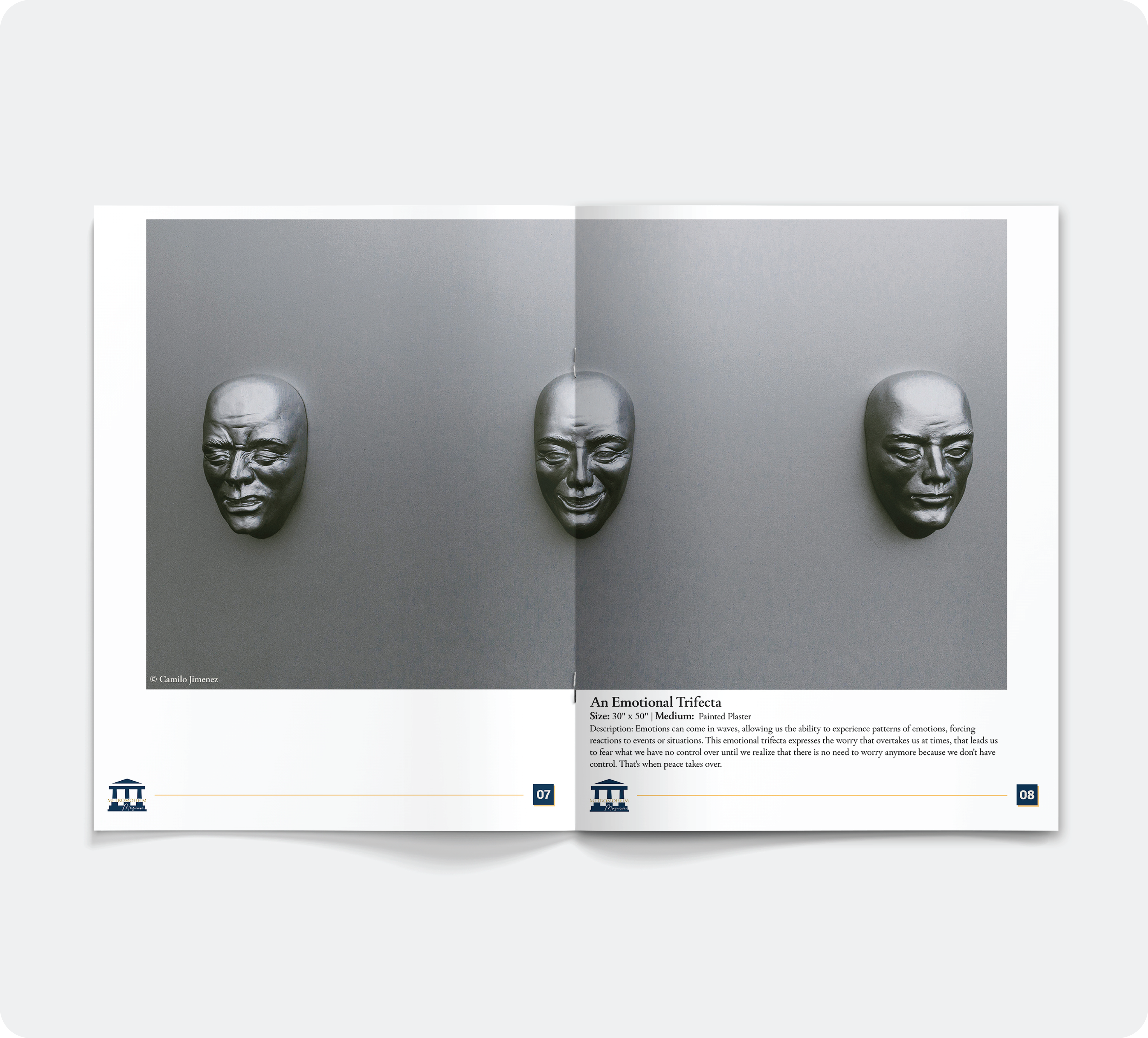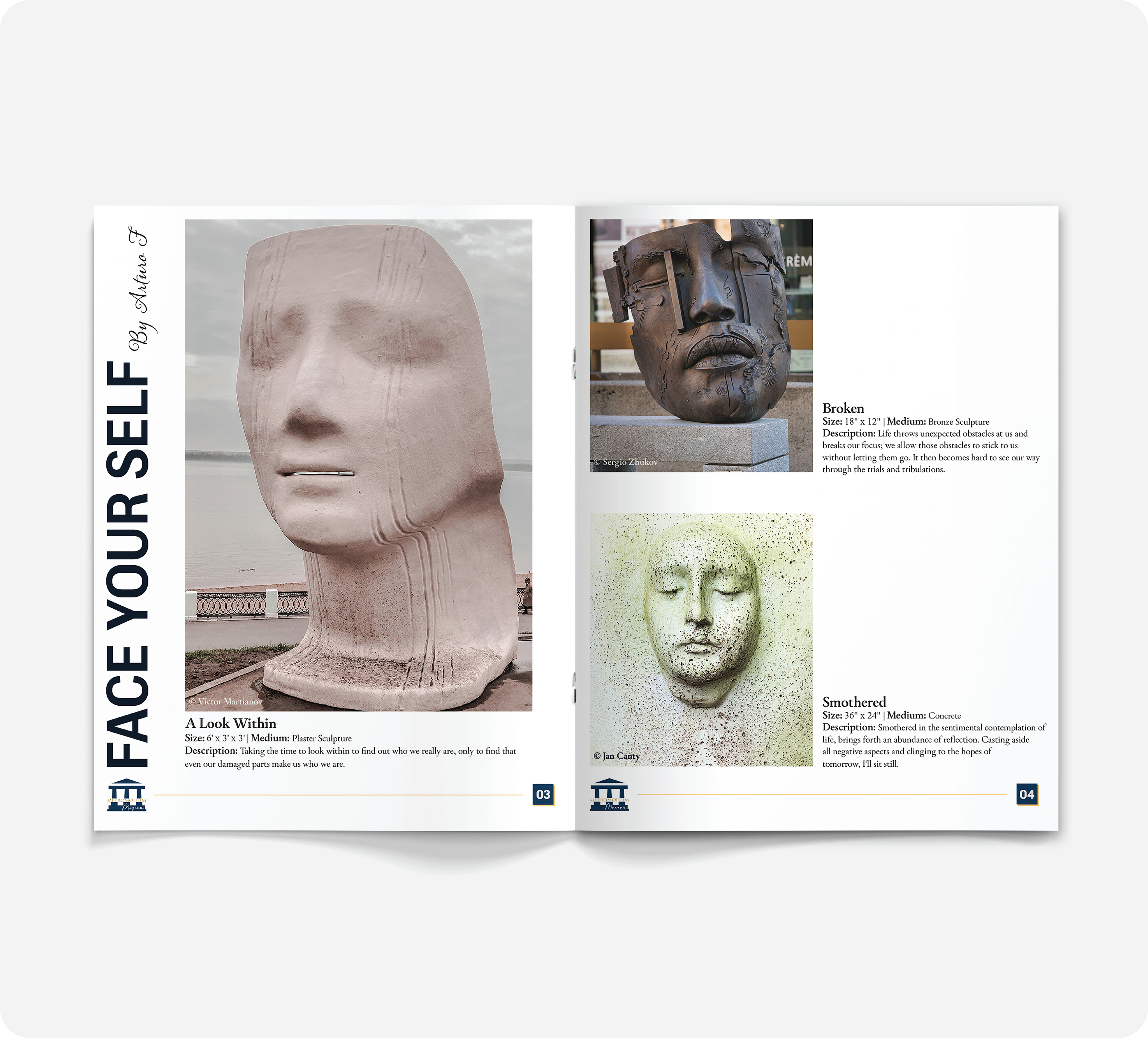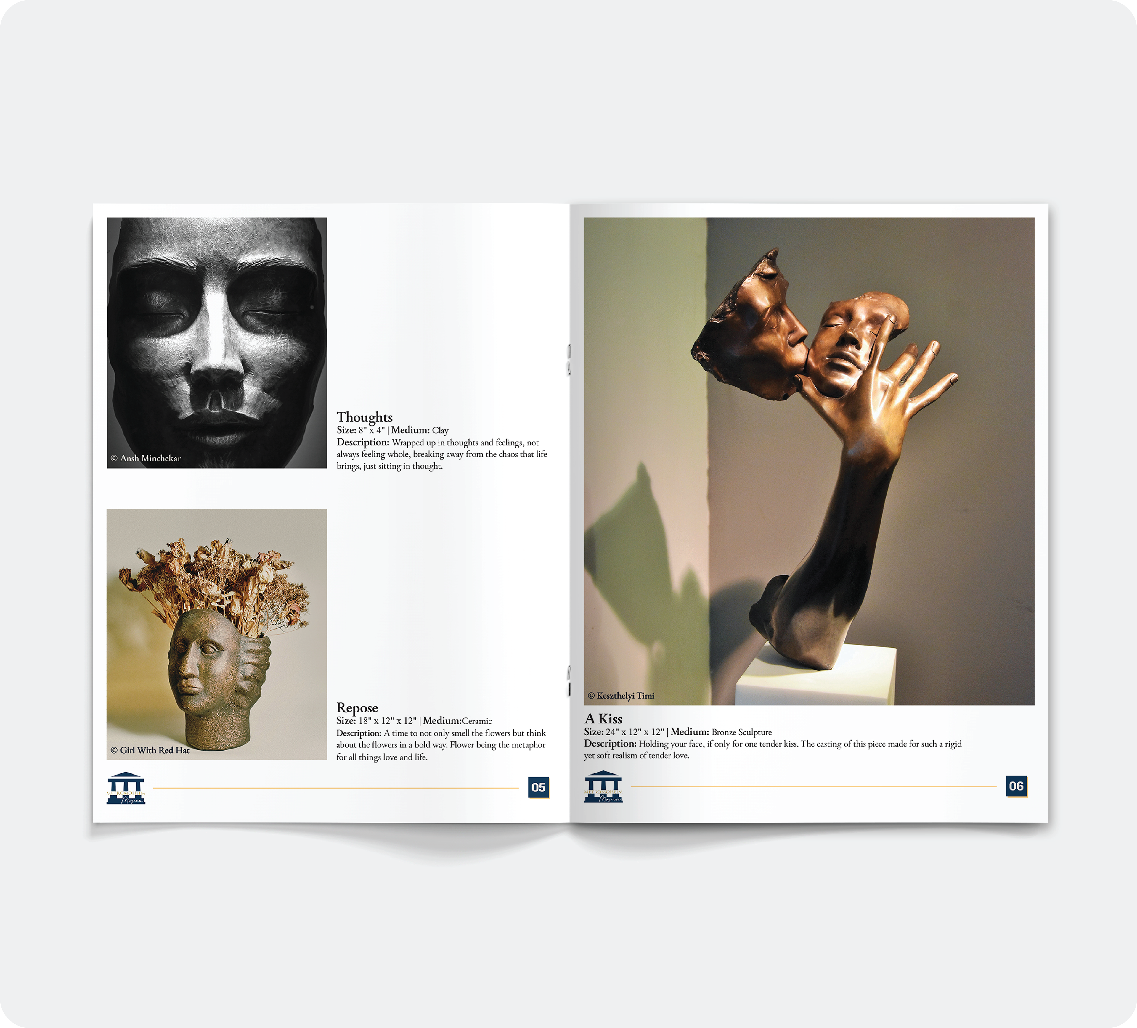 The catalog was designed for an audience of researchers, curators, and art enthusiasts. It combines detailed descriptions, artist statements, and visual documentation in both digital and print formats. A hybrid of manuscript and modular grids was used to create structure and flexibility, ensuring consistency across platforms. Clean typography and an asymmetrical layout enhance readability while emphasizing the artwork. Repetitive elements, such as a consistent image-title-description flow, create rhythm and guide readers through the pages.